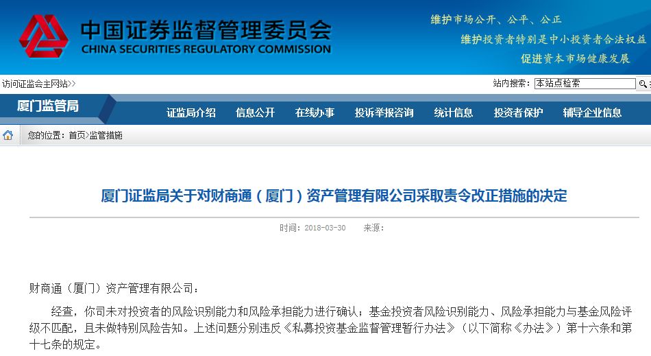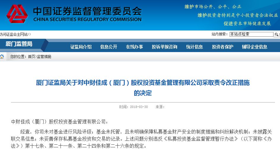有两家厦门的私募在今年3月也收到了证监局的责令整改决定书。