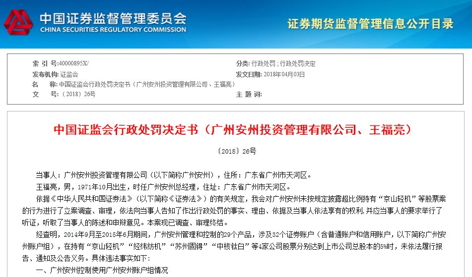 今年4月,证监会发布行政处罚决定书。据证监会调查,2014年9月至2015年6月期间,广州安州投资管理和控制的29个产品,涉及32个证券账户(含普通账户和信用账户),在持有“京山轻机”“经纬纺机”“苏州固锝”“中核钛白”等4家公司股票分别达到上市公司总股本的5%时,但是未依法履行报告、通知及公告义务。
