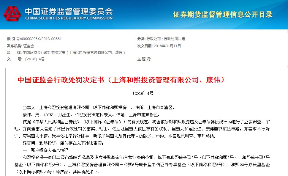 今年1月份证监会的一则行政处罚决定书揭露了3年前的一桩超比例持股未公告、限制转让期违规交易的旧案,涉及私募和熙投资及其掌门人康伟,康伟曾是公募总经理。