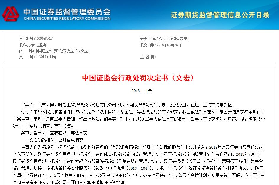今年3月,证监会的处罚决定书显示,上海拓璞投资管理有限公司的投资总监文宏利用知悉的未公开信息,对管理的基金账户与其本人实控账户进行趋同交易(俗称同进同出)1.84亿元,获利251.44万元。证监会决定没收文宏违法所得251.44万元,并处同等金额的罚款。