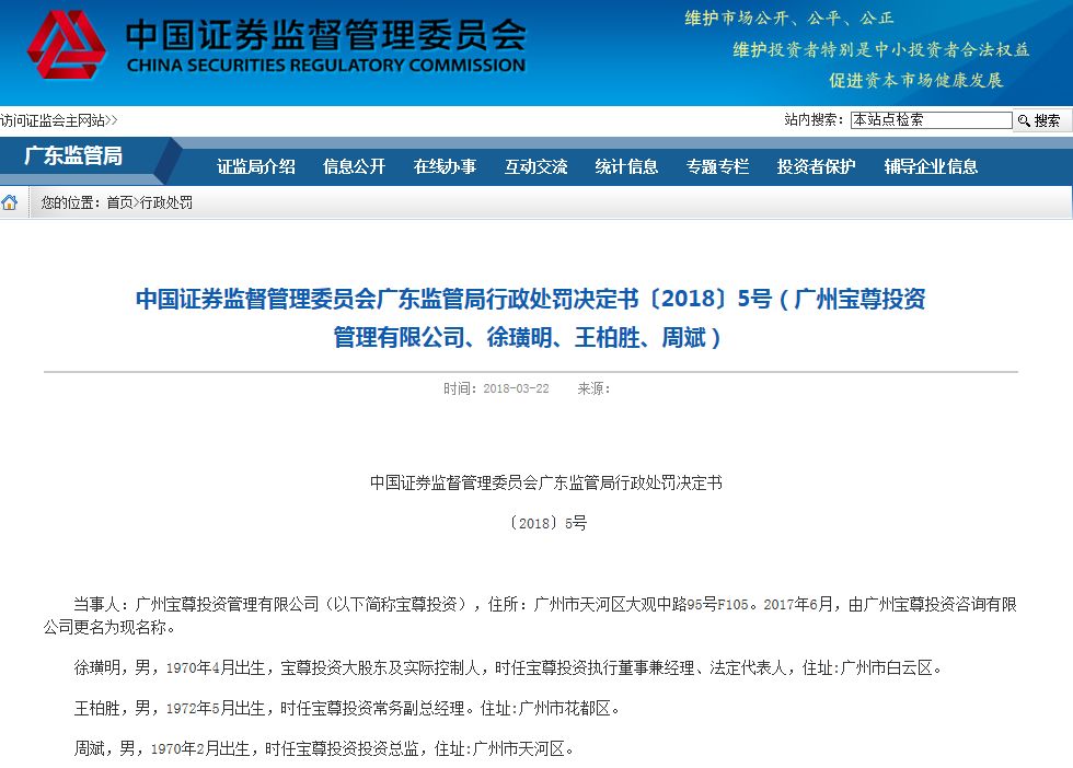 私募广州宝尊投资管理有限公司及其三名主管在今年3月接到了广东证监局的罚单。