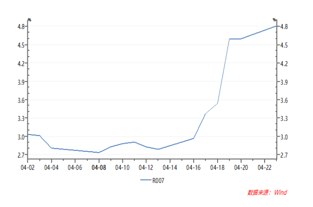 上周二(4月17日),银行间代表性7天期回购利率R007加权利率跳涨40BP,回到3%这条“荣枯线”以上,随后一路涨至3.54%、4.60%、4.80%。