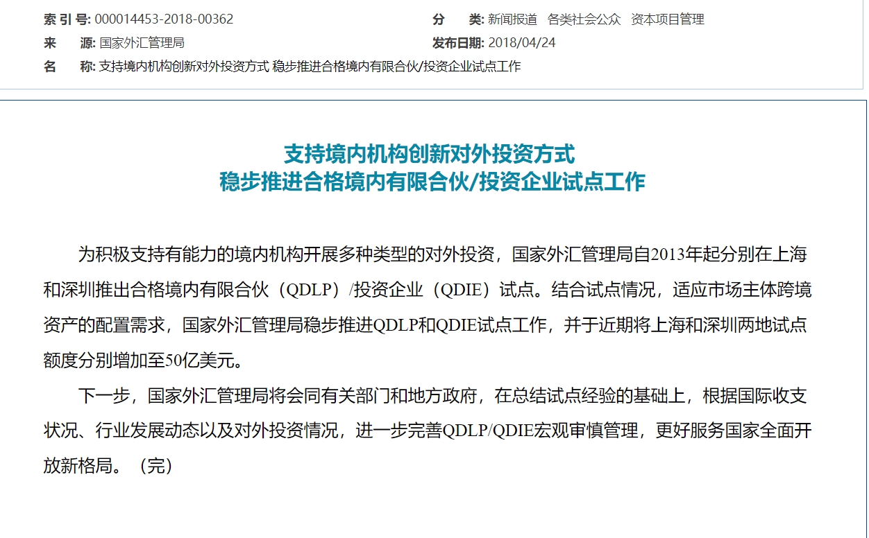 外管局发文称,为积极支持有能力的境内机构开展多种类型的对外投资,国家外汇管理局自2013年起分别在上海和深圳推出合格境内有限合伙(QDLP)/投资企业(QDIE)试点。结合试点情况,适应市场主体跨境资产的配置需求,国家外汇管理局稳步推进QDLP和QDIE试点工作,并于近期将上海和深圳两地试点额度分别增加至50亿美元。