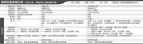 21世纪经济报道记者通过对近40款重疾险的投保年龄、缴费方式、保险期间、等待期、保障范围、附加服务、投保示例的比较(详见图表),希望为消费者提供更为客观的参考。