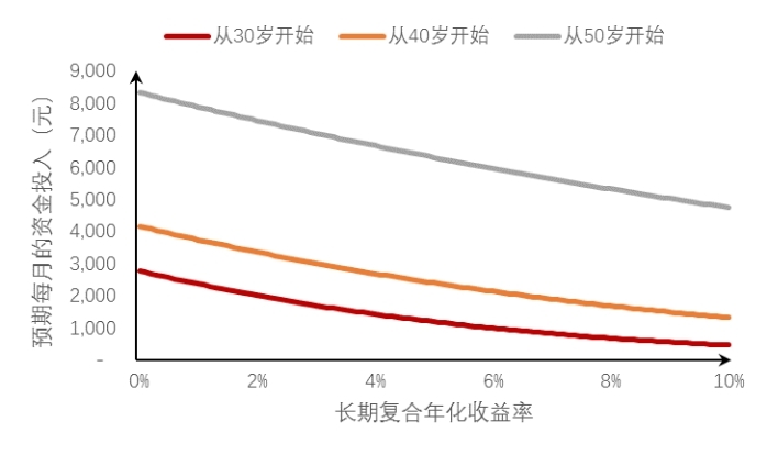 在目标金额固定的前提下,长期定投每期需要投入的金额会较短期定投更少,从而对日常生活的影响更小。这里我们用一张图来进行简单的说明。这个图展示的是,如果要在60岁退休时积攒100万养老金,从不同年龄段开始定投,在不同的长期复合年化收益率下,每月需要投入的金额这三者的关系。如图所示,在相同的长期复合年化收益率下从30岁开始的投资方案,预每个月所需投入的资金会明显少于从50岁开始的投资方案。也就说越早开始投资,预期每月的资金投入也就会越少。坚持长期定投,能让我们积累养老金的压力大大减小,所以,为什么不早点开始呢?