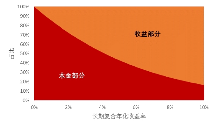 投资收益率是养老金积累过程中一个重要的影响因素。大家可不要小看了收益率提升的作用,即使一点点的收益率提升,都能让养老金积累事半功倍。其中的奥秘就是复利效应。从上图你就已看出随长期复合年化收益率的增长,每条曲线都呈下滑趋势,也就说伴随着收益率的提升,每月需要投入的资金也会减少。其实这个不难理解,我们最终能拿到的养老金包含本金和投资收益两部分,在总目标相同的前提下,收益率提升也就意味着投资收入提升,那么需要投入的本金自然就相应减少。从下图看,可能更直观,这张图展示的从30岁开始定投,在不同的长期复合收益率下,退休时养老金中本金部分和投资收益各自的占比。可以看到当收益率为0时,我们的养老金将全部来自于本金投入。当年化收益率接近10%时,本金投入只占约20%,而投资收益部分将占到约80%!