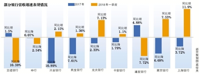 2017年年报中有一半营收负增长,兴业银行、民生银行、光大银行、平安银行4家银行2017年营收分别同比下降10.89%、7.01%、2.33%、1.79%。到今年一季度,四家银行的营收增速纷纷转负为正。