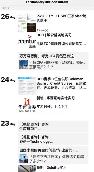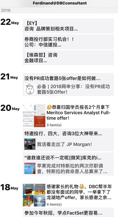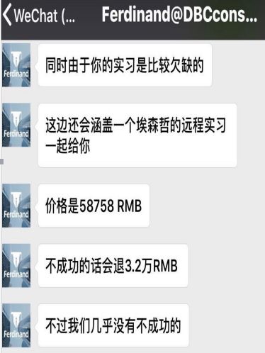 一位正在求职的金融专业应届毕业生就给记者举例,一个针对金融类海外留学生找金融相关工作的微信号Ferdinand@DBCconsultant就向学生保证,通过一系列培训后可以拿到一些公司的offer,费用高至五万多人民币。