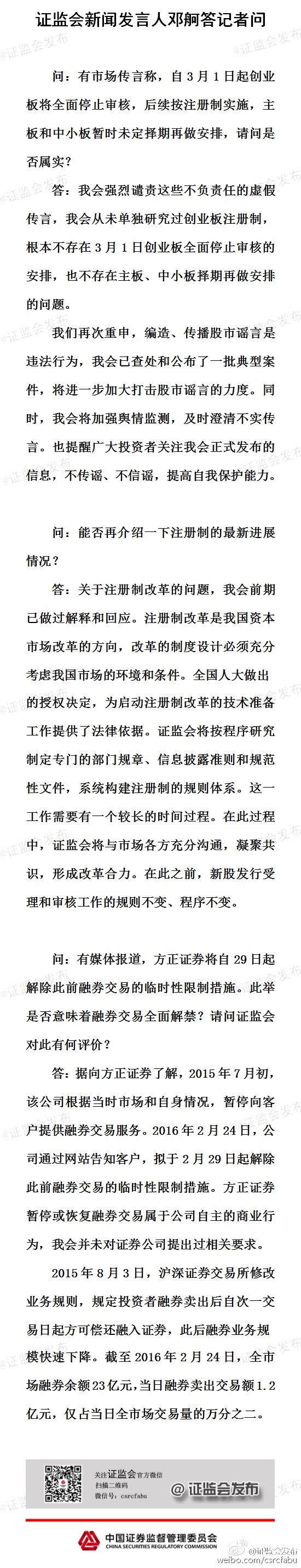 中国经济网北京2月26日讯 今日早间,证监会微博发布消息,新闻发言人邓舸就创业板全面停止审核传言、注册制最新进展等问题答记者问,以下为全文:
