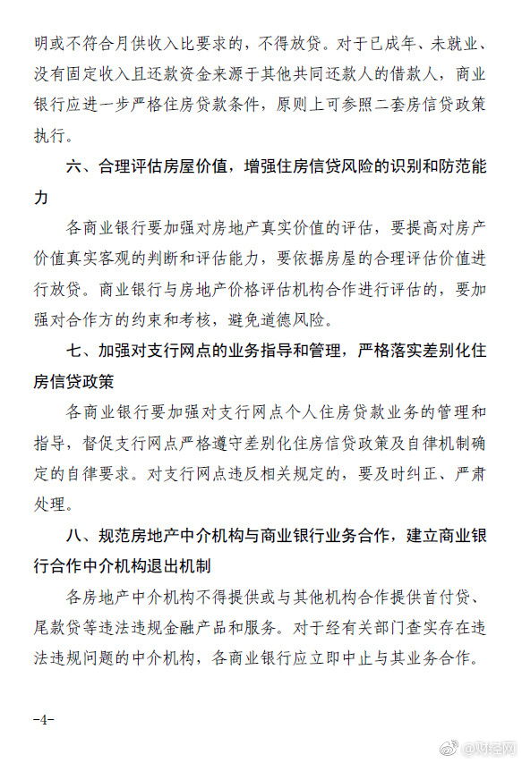 各商业银行要加强对房地产真实价值的评估,要提高对房产价值真实客观的判断和评估能力,要依据房屋的合理评估价值进行放贷。商业银行与房地产价格评估机构合作进行评估的,要加强对合作方的约束和考核,避免道德风险。