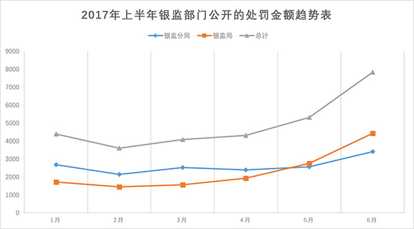 澎湃新闻统计发现,2017年上半年,银监会网站上公开的罚单数量和罚单金额均呈上升趋势,二季度趋势尤为明显。