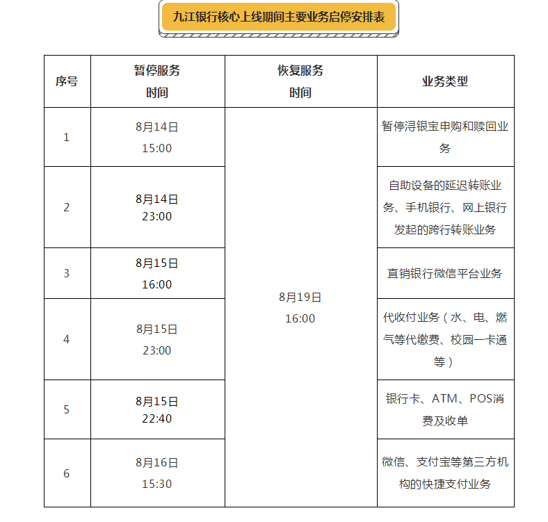 为提供更加优质高效的金融服务,经向相关监管部门报备,我行新一代核心系统将于近期上线,2019年8月16日16:00-8月19日16:00上线期间,各营业网点及其它服务渠道将暂停办理各项业务(其中银行卡、POS消费及收单等业务将提前暂停服务),时间安排详见《九江银行核心上线期间主要业务启停安排表》。