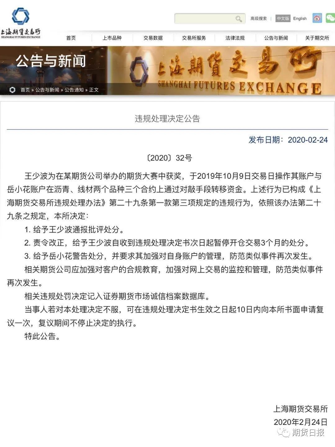 上期所对其处罚结果为:1. 给予王少波通报批评处分。2. 责令改正,给予王少波自收到违规处理决定书次日起暂停开仓交易3个月的处分。3. 给予岳小花警告处分,并要求其加强对自身账户的管理,防范类似事件再次发生。另:相关期货公司应加强对客户的合规教育,加强对网上交易的监控和管理,防范类似事件再次发生。相关违规处罚决定记入证券期货市场诚信档案数据库。
