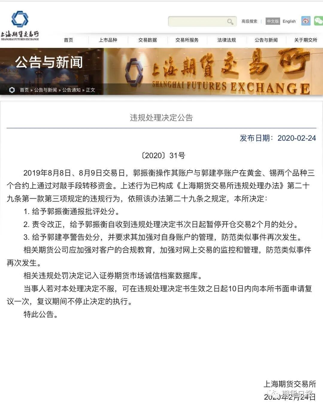 上期所对其处罚结果为:1. 给予郭振衡通报批评处分。2. 责令改正,给予郭振衡自收到违规处理决定书次日起暂停开仓交易2个月的处分。3. 给予郭建亭警告处分,并要求其加强对自身账户的管理,防范类似事件再次发生。相关期货公司应加强对客户的合规教育,加强对网上交易的监控和管理,防范类似事件再次发生。相关违规处罚决定记入证券期货市场诚信档案数据库。