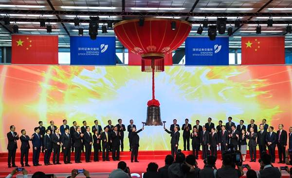 图为8月24日在深圳证券交易所举行的创业板改革并试点注册制首批企业上市仪式上拍摄的敲钟仪式。 新华社记者 毛思倩 摄