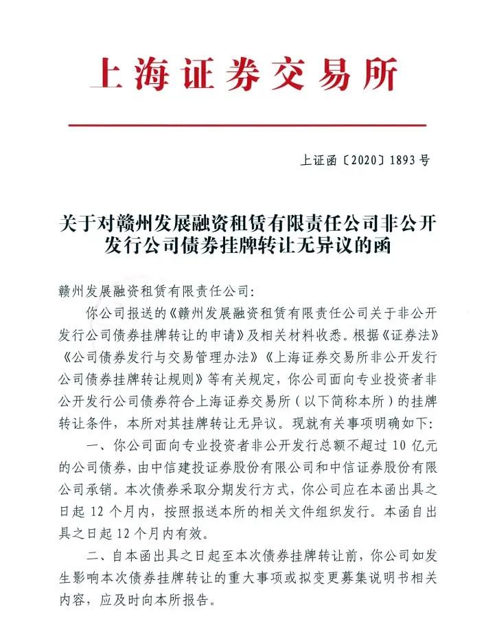 本站讯 9月1日,赣州发展融资租赁有限责任公司成功取得上交所出具的非公开发行公司债无异议函,金额不超过10亿元,期限3年。这是赣州发展融资租赁公司首次发行公司债,也是江西省内首家获得上交所批准发行公司债的商业融资租赁公司,更是该公司在资本市场拓宽融资渠道的一次重要尝试。