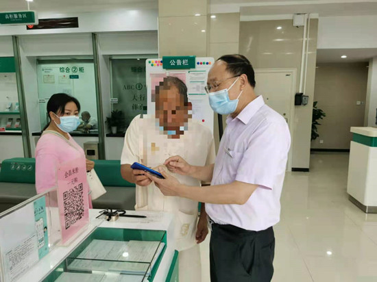 本站讯 8月4日下午,农行南康区金鸡支行正常营业中,一位年过六旬的陈姓老人慌张地来到网点要求汇款,大堂经理询问后,引导客户到超级柜台办理。