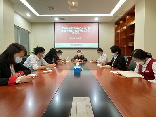 本站讯 为切实落实赣州市人民政府、人行赣州中支及银保监会赣州分局联合下发的《关于进一步加强新冠肺炎疫情防控工作的通知》(以下简称“通知”)文件精神,3月21日,中信银行赣州分行召开疫情防控专题部署会,全面宣贯通知精神和要求,分行班子成员和各部门负责人参加了会议。