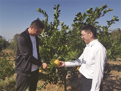 图为上犹农商银行油石支行客户经理现场走访刘大华脐橙基地的挂果情况。 邓慧 摄