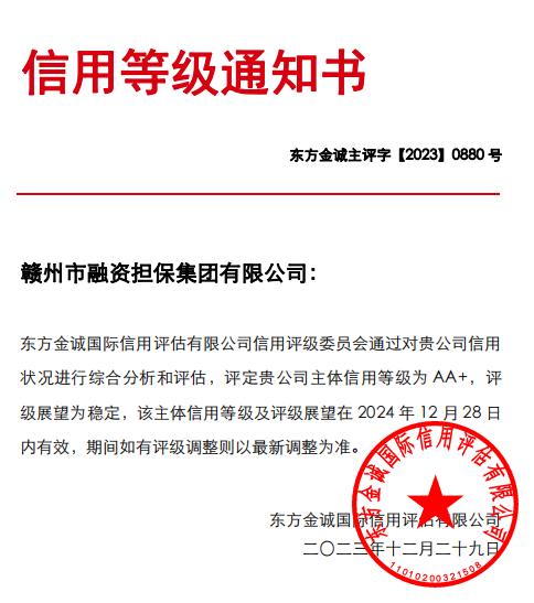 本站讯 近日,国内权威信用评级机构东方金诚国际信用评估有限公司完成了对赣州市融资担保集团有限公司信用状况的综合分析和评估,评定集团公司主体信用等级为 AA+,评级展望为稳定。自此,赣州市融资担保集团公司已连续两年获评主体信用等级AA+。
