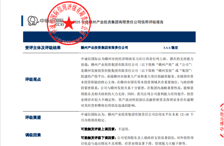 本站讯 近日,中诚信国际信用评级有限责任公司正式授予赣州产业投资集团有限责任公司AAA主体信用等级。这是继2024年12月30日获评东方金诚国际信用评估有限公司AAA评级后,赣州产投集团在短期内再次获得国内权威评级机构AAA最高信用评级。成为江西省首家获得“双AAA”主体信用评级的产业投资集团,亦是中诚信在江西省评定的首家AAA级产业投资集团。