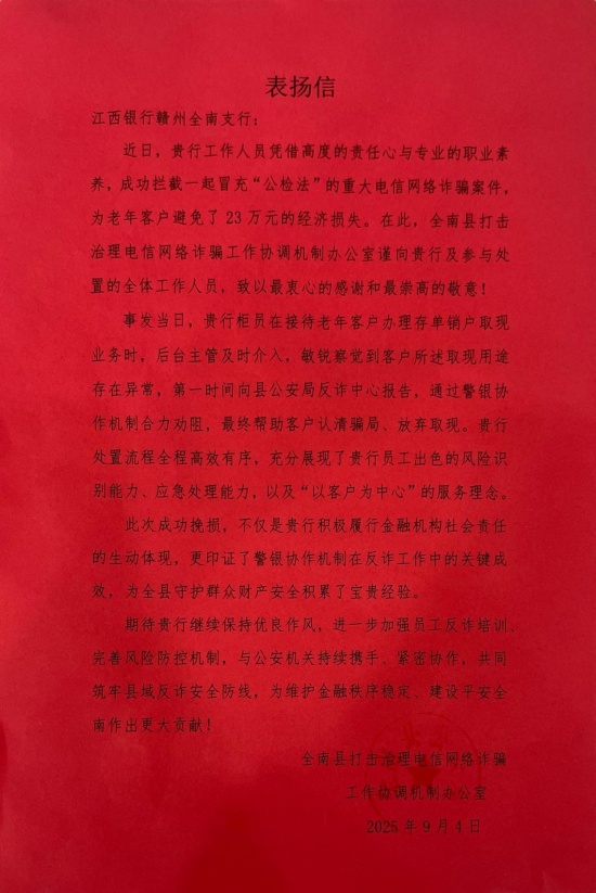 本次金融教育宣传周不仅是知识的广泛普及,更是对分行消费者权益保护工作成效的一次集中展示和生动实践。活动期间,全南支行员工凭借高度的责任心与专业的风险识别能力,在办理业务时及时察觉一名客户的转账行为异常。经耐心询问与反复核实,确认该客户正遭遇电信诈骗,工作人员立即予以劝阻,成功为客户保住23万元血汗钱。当地公安局特意发来感谢信,对该行员工的专业素养与守护群众财产安全的担当精神给予高度赞扬。