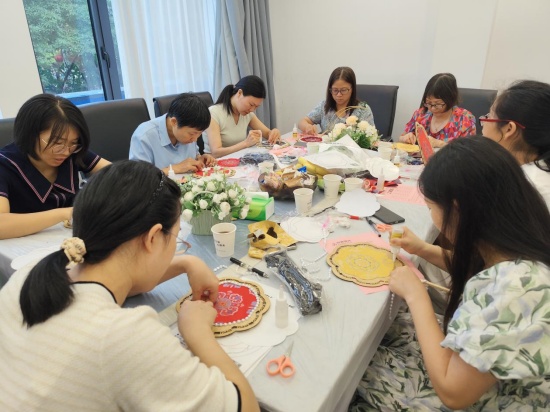 手工环节,师生们专注投入:裁剪宋锦、粘贴扇骨、点缀珍珠,每一步都饱含用心。大家或设计独特珍珠图案,或交流创作思路,现场氛围温馨融洽。我行工作人员穿梭其间,一方面协助师生选配材料、沟通设计细节,另一方面结合教师群体日常财务需求,以通俗易懂的语言普及金融知识:从工资理财的稳健方式、信用卡理性使用技巧,到防范电信诈骗的“三不一要”原则(不轻信、不透露、不转账,遇到疑问及时报警),将专业金融知识融入轻松的互动场景,让老师们在动手创作之余,也收获了实用的财务规划思路。近两小时后,一把把兼具非遗韵味与节日祝福的珍珠扇诞生,既承载着对教师的敬意与对文化的热爱,也让金融知识悄然走进师生心中。