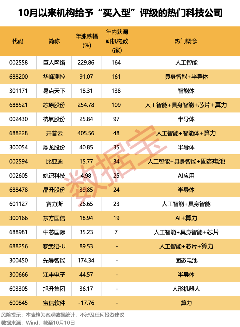根据所属的万得热门概念,进一步分析来看,上述80只获机构给予“买入型”评级的个股中,不少公司涉及算力、人工智能、具身智能、半导体、固态电池等热门科技领域,相关公司有芯原股份、华峰测控、寒武纪-U等18家。