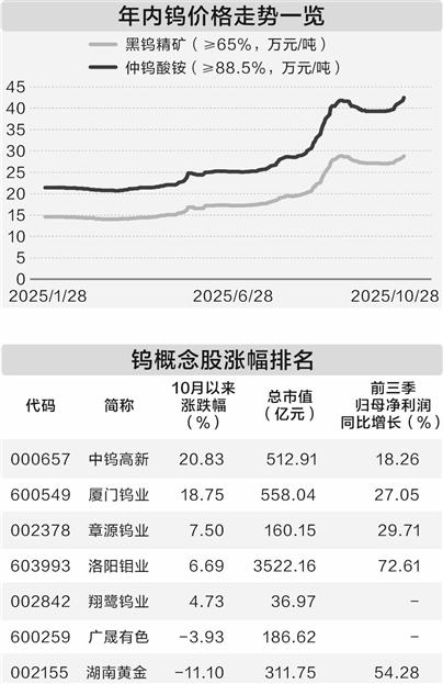 据证券时报·数据宝统计,A股中布局钨生产的个股共有7只,10月以来多数股价上涨,中钨高新累计上涨20.83%,居于首位,厦门钨业、章源钨业、洛阳钼业随后,分别上涨18.75%、7.5%、6.69%。