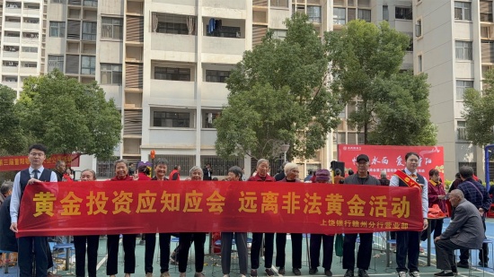 10月27日,赣州分行营业部联合水西镇商会,在水西镇社区开展了以“情满水西 爱在重阳”为主题的重阳节大型公益活动,重点开展“黄金投资应知应会 远离非法黄金活动”金融知识宣传。工作人员通过横幅展示、资料发放、一对一讲解等多种形式,向老年群众普及黄金投资的正规渠道与风险防范知识,提醒大家远离非法黄金活动,提升金融安全意识。