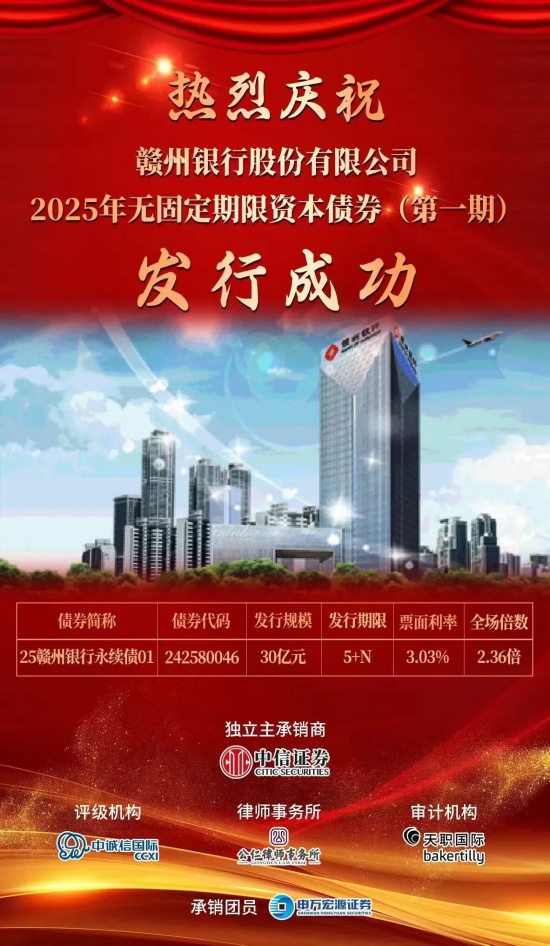 本站讯 10月28日,赣州银行在全国银行间债券市场成功簿记发行2025年无固定期限资本债券(第一期),总发行规模30亿元,发行票面利率3.03%,债券期限5+N年期。赣州银行本期永续债发行,在市场上取得较好的反响,获得市场上各投资者的高度认可,投资机构有银行、基金、券商等各类投资者,簿记当日市场机构投标活跃,全场认购倍数达2.36倍,充分体现了市场对赣州银行品牌的认可。