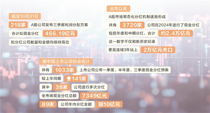 截至10月31日,218家A股公司发布三季报利润分配方案,合计拟现金分红466.19亿元,拟分红公司数量和金额均保持高位。