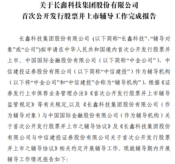 在产品和市场进展势如破竹的同时,长鑫存储的IPO之路也在提速。仅仅历时3个月,长鑫科技集团股份有限公司(简称“长鑫科技”,上市主体)IPO辅导工作完成。