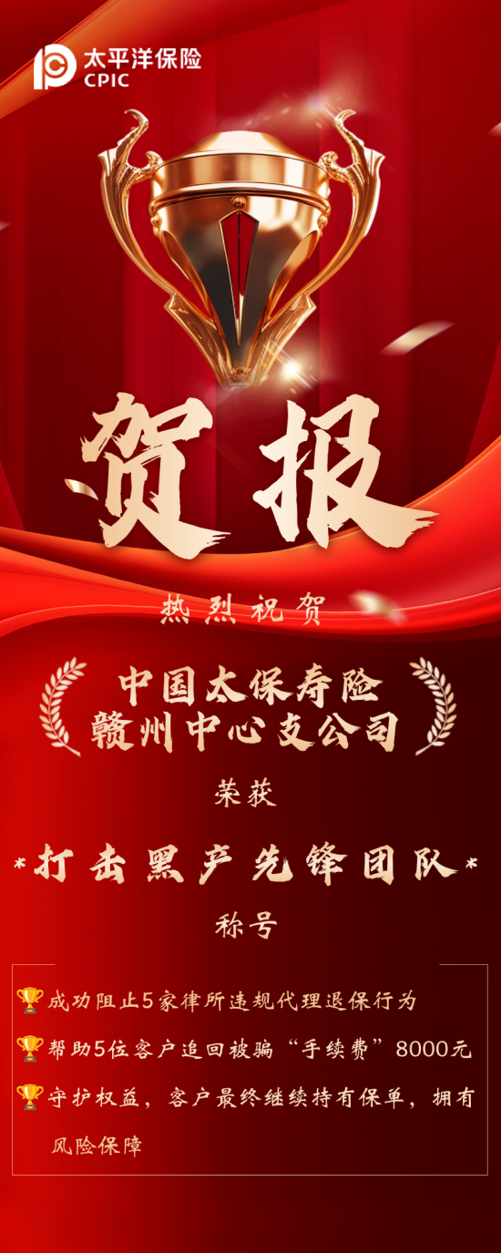 热烈祝贺中国太保寿险赣州中心支公司荣获“打击黑产先锋团队”称号