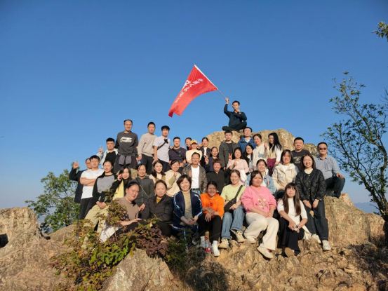 途中,大家意气风发,步伐坚定。登山路上,队伍宛如一条充满活力的长龙,沿着蜿蜒的山路向上进发,同事们互相鼓励,彼此扶持,欢声笑语与加油鼓劲声在山林间回荡,形成了一道亮丽的风景线。陡峭处的援手,疲惫时递上的清水,都生动诠释了“齐心”二字的深刻内涵。经过一个多小时的攀登,同事们相继成功抵达山顶,极目远眺,群山叠翠,风光尽收眼底。成功的喜悦洋溢在每个人的脸上,在山顶上,大家交流着攀登过程中的心得与感悟,气氛热烈而融洽。