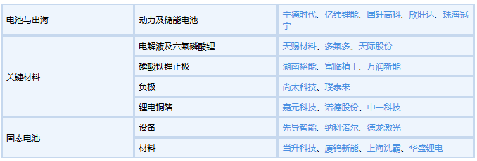 1.电池与出海链:作为直接受益于全球动储需求高景气的核心环节,产能出海领先的头部电池厂将率先享受行业增长红利,受益标的包括宁德时代、亿纬锂能、国轩高科、欣旺达、珠海冠宇等。