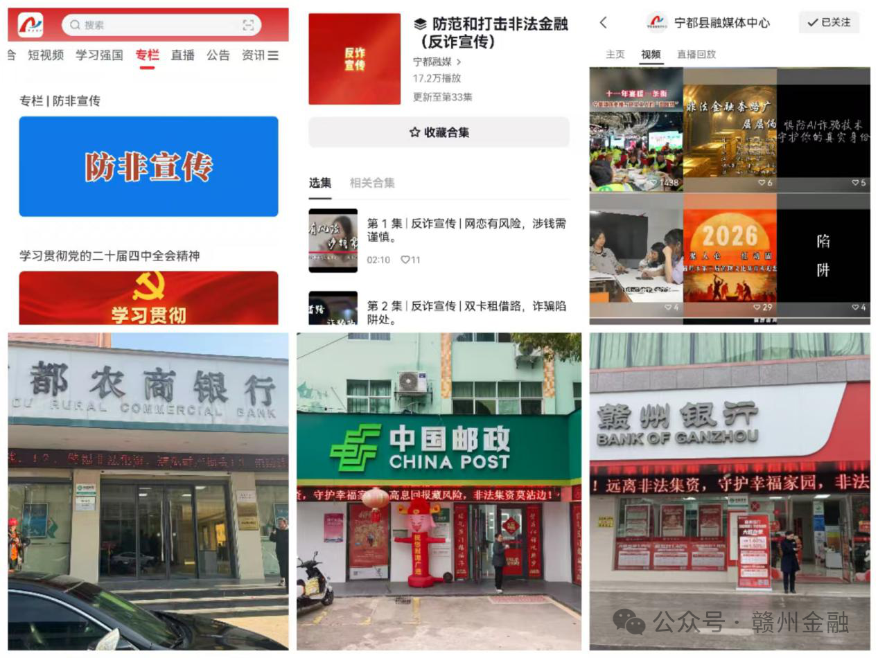 三、联动多方力量,拓宽宣传渠道。一是宁都县域各银行网点充分发挥阵地作用,利用LED显示屏滚动播放防非宣传标语,营造浓厚警示氛围;二是宁都县融媒体中心精准发力,在“掌上宁都”APP开设防非宣传专题,同时通过微信视频号、抖音号推送防非宣传视频,构建起“线上+线下”联动、多维度渗透的宣传格局。