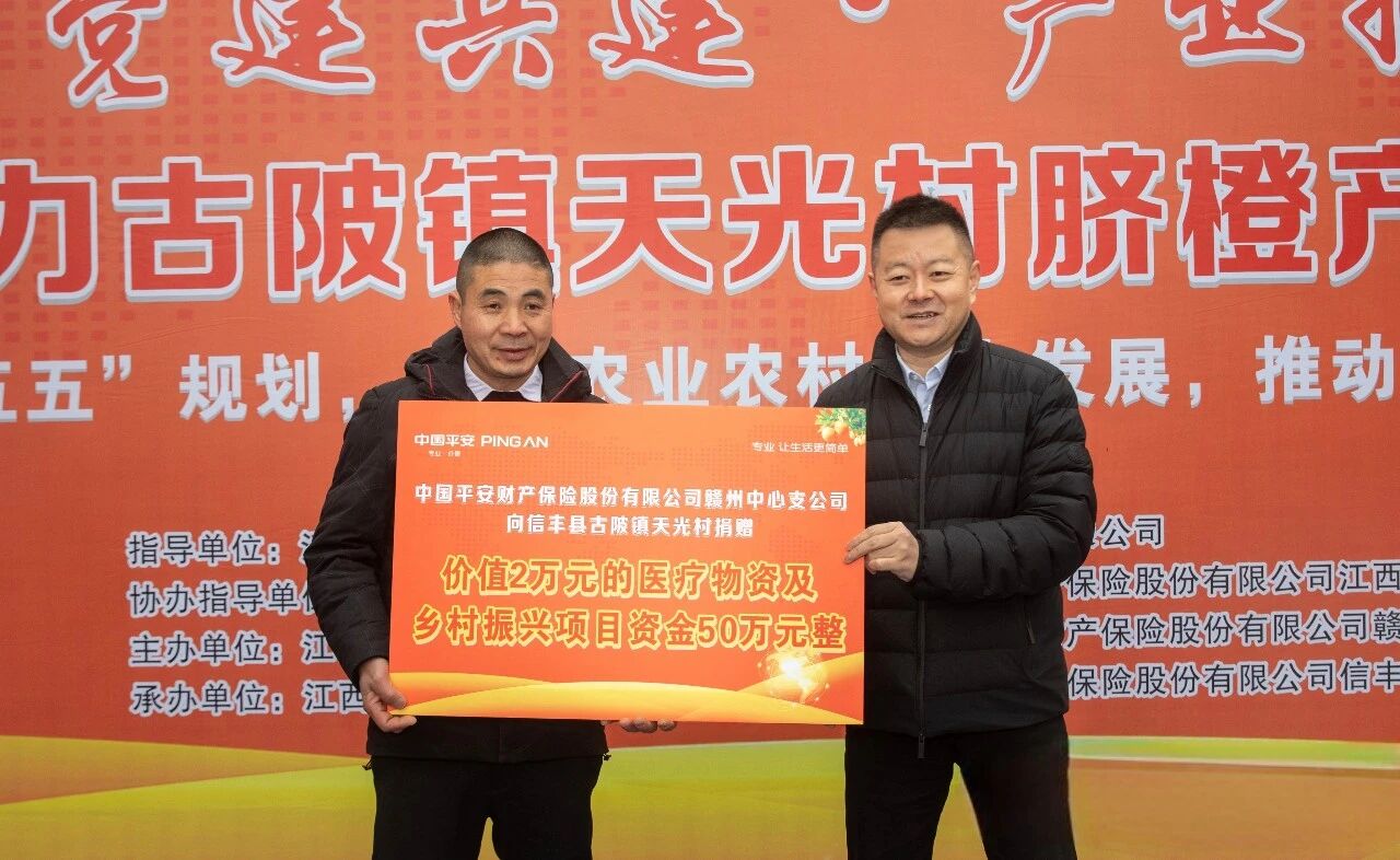 本站讯 为深入贯彻落实“十五五”规划关于农业农村优先发展的战略部署,切实推动乡村产业全链条升级,1月22日,平安产险在赣州市信丰县古陂镇天光村成功举办“党建共建·产业振兴”脐橙产业帮扶行动。市委常委、副市长王建冬,平安产险总部团体事业群农村保险部总经理梁晓东,平安产险江西分公司党委书记、总经理郝瑞林,平安产险赣州中支总经理毛跃斌,以及信丰县领导叶瑞云、卢华文等共同出席活动。