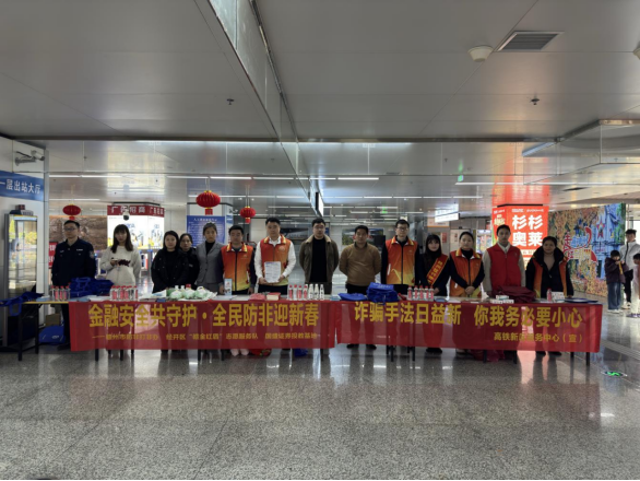 1月29日下午,由赣州经开区金融服务中心牵头,区公安分局、区经发局、凤岗镇、高铁新区服务中心、复兴路派出所携手国盛证券教育基地、招商银行、赣州银行等单位组成联合宣传队伍,在赣州高铁西站开展“金融安全共守护 全民防非迎新春”主题宣传活动。活动以多元化、立体化宣传形式,织密织牢金融安全防护网,全力营造“全民防非、主动拒非”的浓厚社会氛围,切实提升群众金融安全防范意识和能力。