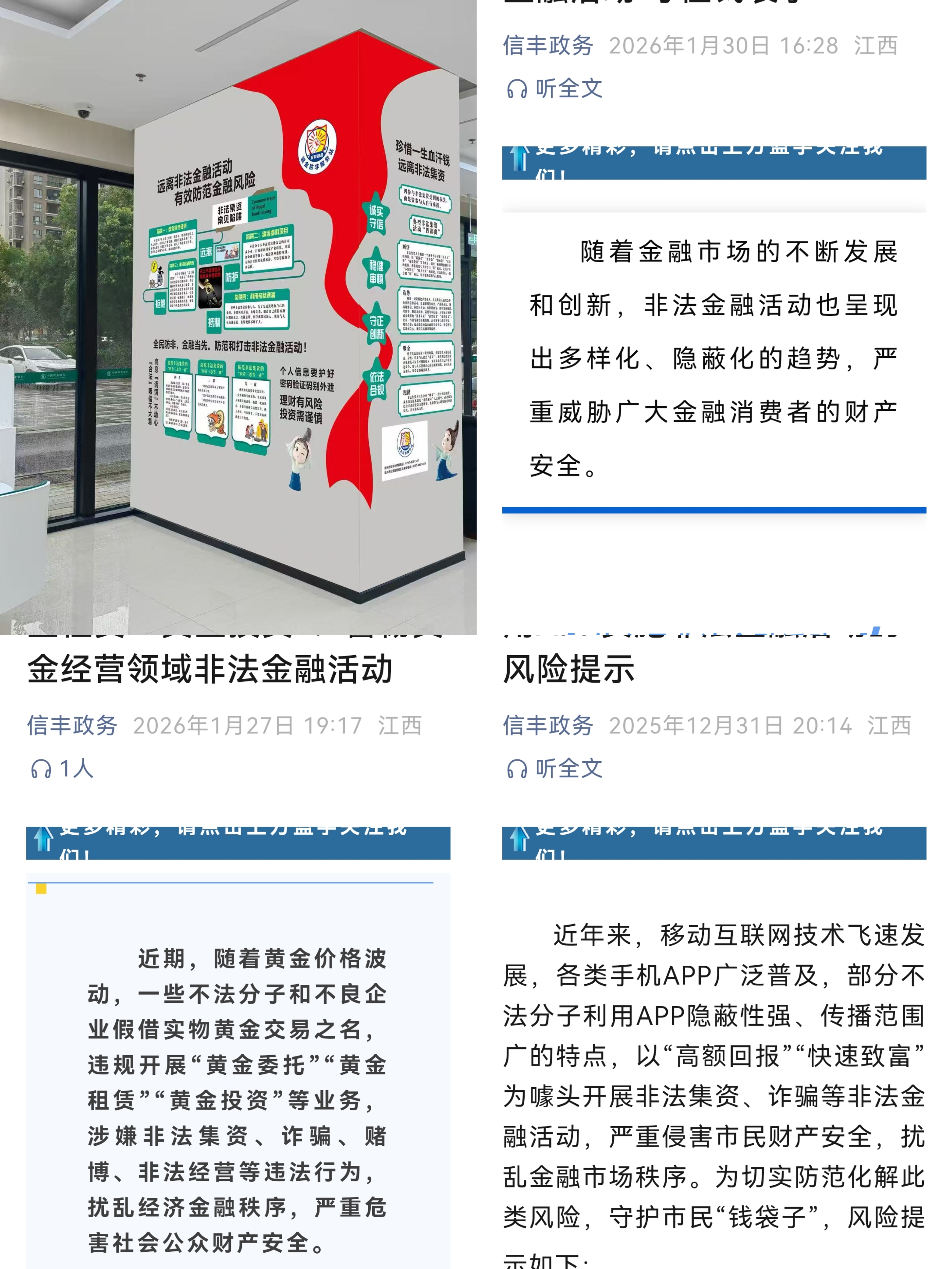 积极顺应数字化趋势,充分发挥线上平台传播快、覆盖广的优势。依托各类社区居民微信群、官方公众号等网络载体,定期推送警示教育短片、动漫,及时发布关于“黄金委托租赁”“警惕非法金融APP”等风险提示信息。鼓励居民积极学习、主动转发,让防范非法金融知识突破时空限制,实现宣传全域覆盖。同时,倡导居民争当防非宣传志愿者,向亲友分享防非知识,全面提升社会公众“知非、识非、拒非”的意识和能力。