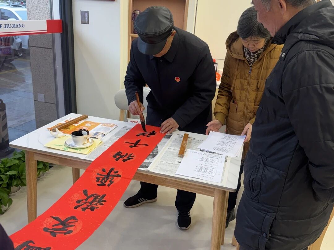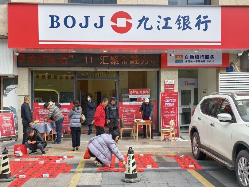 章贡支行、蓉江新区支行、信丰支行等网点开启送福模式,联合居委会、小区物业、走进企业开展送春联活动;营业部、寻乌支行、赣江源社区支行等网点举办手写对联活动,工作人员提前备好笔墨纸砚,邀请书法爱好者现场挥毫泼墨,一幅幅笔力遒劲的春联、一个个喜庆吉祥的福字,承载着新年的期许,也传递着九江银行的温情,笔墨书香间,将最真挚的新年祝福写进春联里,送到居民手中。