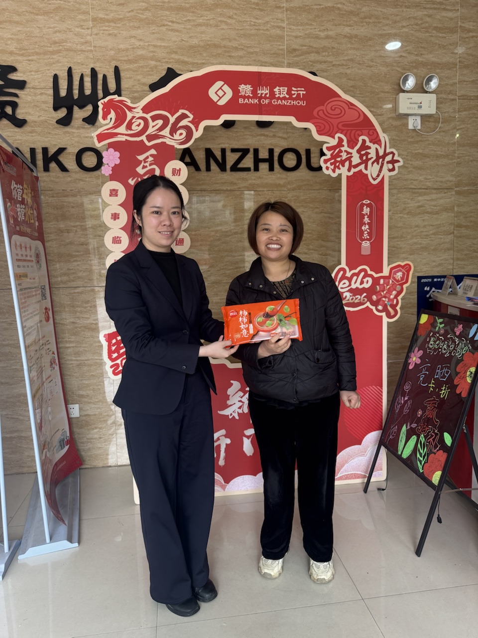 在业务办理间隙,工作人员主动为前来办理业务的客户送上节日礼品。“阿姨,今天办业务还能领份元宵礼,祝您新的一年顺顺利利!”一句句亲切的问候,让不少客户脸上露出了笑容。大家拿着礼品,在喜庆的拱门前合影留念,快门声里满是节日的欢喜。