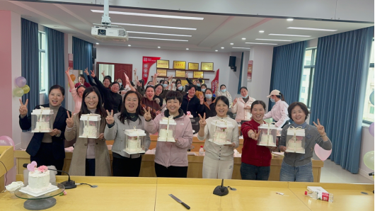 活动现场暖意融融、香气四溢。支公司提前准备了新鲜蛋糕胚、绵密奶油、缤纷鲜果及精致装饰配件,特邀专业烘焙师现场教学,细致讲解蛋糕抹面、裱花造型、水果搭配等制作技巧,并进行手把手示范指导。平日里坚守岗位、干练从容的女员工们,纷纷换上围裙,化身巧手甜点师,沉浸在动手创作的乐趣之中。大家或专注抹平奶油,或创意搭配装饰,或互相交流心得、协作完成作品,指尖流转巧思,欢声笑语充盈全场,充分展现了新时代女性温婉灵动、积极向上的精神风貌。