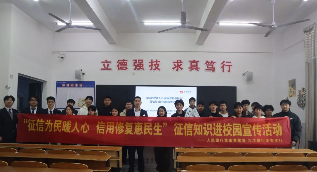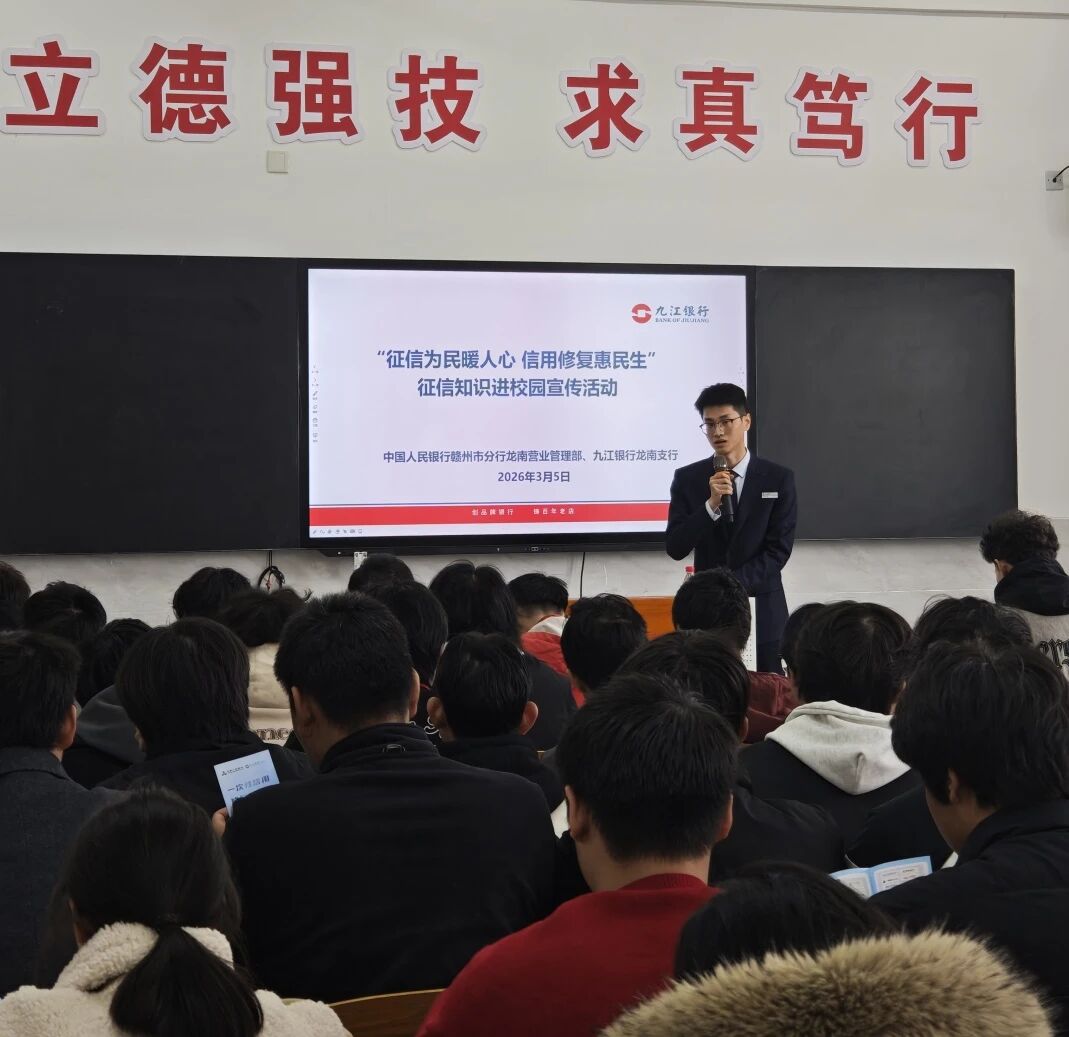 3月5日,正值春季开学伊始,九江银行龙南支行联合人民银行赣州市分行龙南营业管理部前往江西文理技师学院龙南校区,开展以“征信为民暖人心 信用修复惠民生”为主题的征信知识进校园宣传活动,为近百名师生普及征信知识、解读信用政策,切实提升青年群体诚信意识与金融素养。