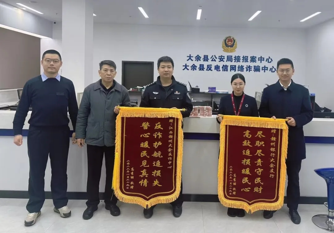 近日,河北省公安机关工作人员与受骗客户专程赶赴赣州银行大余支行,将一面锦旗送到支行网点,对支行成功拦截诈骗资金表示由衷感谢。