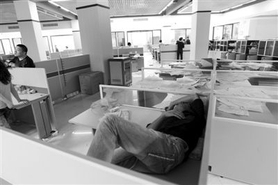 温州近9成家庭被指卷入高利贷,20多位老板跑路。9月26日,浙江温州,讨要材料款的供货商躺在信泰集团办公桌上。张宏伟 摄