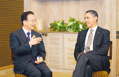 11月19日,国务院总理温家宝在印尼巴厘岛出席东亚领导人系列会议期间会见美国总统奥巴马。新华社记者 李学仁摄
