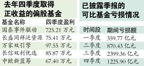 358只基金逆市取得正收益。QDII基金、货币基金及债券型基金成为盈利大户,南方全球精选四季度利润额为7.08亿元,在所有类型的基金中位居盈利榜冠军,博时现金收益、嘉实海外中国股票则分别以超过2个亿的正收益勇夺基金单季盈利额榜单亚军、季军宝座。普通股票型基金中,仅有两只实现正收益,分别为国泰事件驱动、长盛同祥泛资源,偏股混合型基金也只有3只正收益,分别为万家双引擎、长信双利优选、中欧新蓝筹。